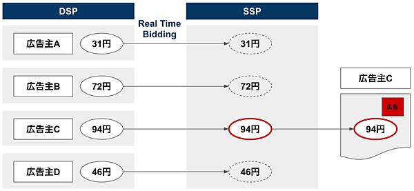 たとえば、複数の広告主がDSPを使って「旅行好きユーザー」に入札しているとします。この場合、プログラマティック広告では、ある特定の広告枠(≒SSP)が読み込まれる度に「リアルタイムビッディング(Real Time Bidding)」を行い、最も高額な価格で入札している広告を自動的に選定し、広告枠に表示させます。こうした仕組みでパブリッシャーは予約型ディスプレイ広告をオークション化し、広告枠に対する入札価格を高め、RPMを向上させようとしたわけです。
