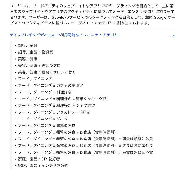 出典:ディスプレイ&ビデオ 360ヘルプ「アフィニティ カテゴリのターゲティング」