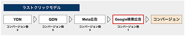 下の図のように、ひとりのユーザーが「GDN」→「GDN」→「Google検索広告」→「Google検索広告」と4回広告をクリックしてコンバージョンに至った場合、ラストクリックモデルでは最後のGoogle検索広告にコンバージョン数が1つ計上されます。