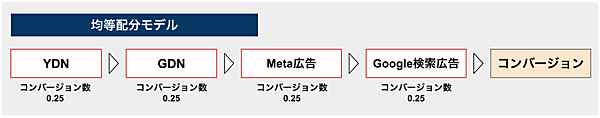一方で、「均等配分」というモデルの場合、コンバージョン数はクリックされた広告に均等に割り振られるため、4回のクリックに等しく0.25ずつ割り当てられます。