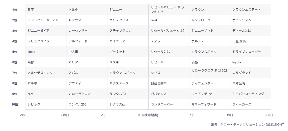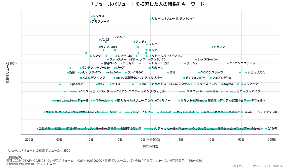 たとえば、近年で言えば、車の価格を調べる際に、同時に、購入した車が数年後にいくらで売れるかという残価を表す「リセールバリュー」で検索する人が増えています。そこで、この「リセールバリュー」で検索した日を起点に、その前後でどんなキーワードが検索されているかを調べてみると、ユーザーの情報収集の流れが見えてきます。