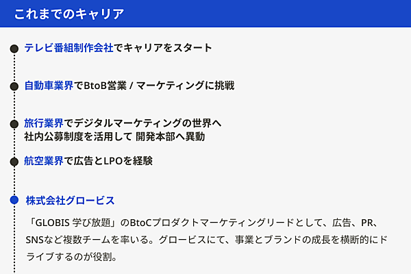 大川内氏はその後、より事業会社側で仕事がしたいと考えて航空業界へ転職した。LPO(ランディングページ最適化)や広告などを担当した後、グロービスに転職。その転職理由をこう語る。