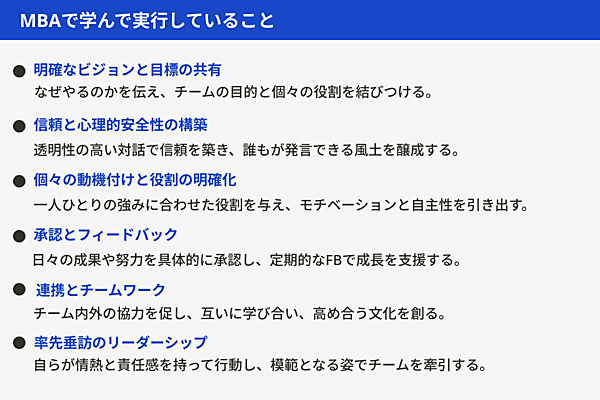 また、「働きながらMBAを取得したことによる心境の変化もあった」と大川内氏は言う。MBAを受講してさまざまな業種や職種でリーダーシップを発揮することを目指している人たちと学びの場で触れ合うことで、人を動かすときに大事なことを少しずつ学んでいくことができた。