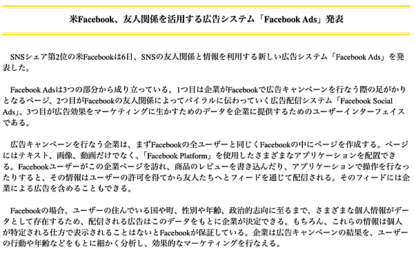 出典:Internet Watch:「米Facebook、友人関係を活用する広告システム『Facebook Ads』発表」(2007年11月7日付け)