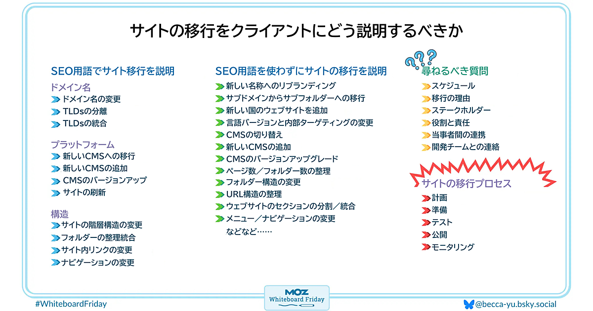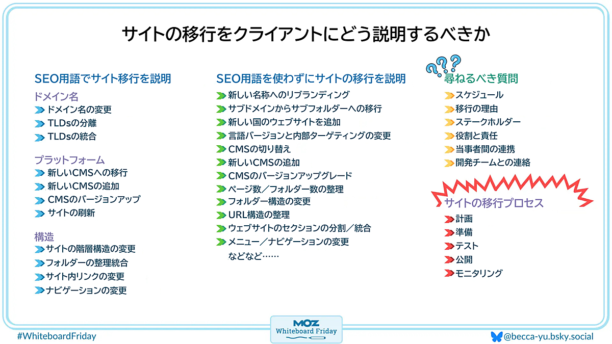 多くの場合、SEO担当者がサイトの移行を知らされるのはあまりにも遅く、時には公開の数日前に伝えられることもある。こうした混乱を避けて正気を保つには、サイトの移行をSEO用語を使わずに理解できるようにすることが極めて重要だ。