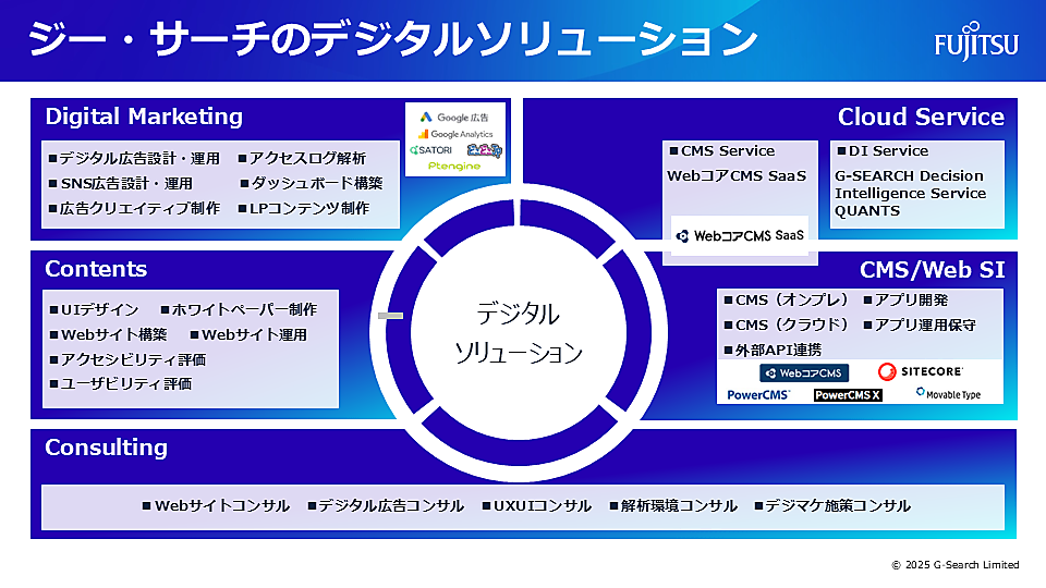 これを裏で支えたジー・サーチでは、Webサイトの立ち上げからデザイン、CMSの導入、アクセス解析までを一貫して支援するデジタルソリューションを提供している。CMSはオープンソース系からエンタープライズ製品まで幅広く取り扱っており、目的や運用体制に合わせて最適な選択をサポートしてくれる。