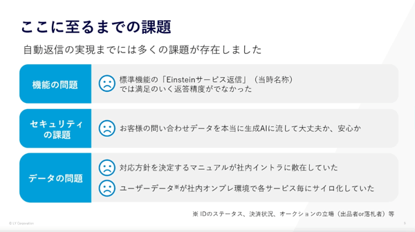 1つ目の課題は「機能の問題」だ。2024年時点では、Salesforceの標準機能「Einsteinサービス返信(当時の名称)」を試験的に導入していたが、当時の性能ではLINEヤフーが期待する返答精度に届かなかったという。