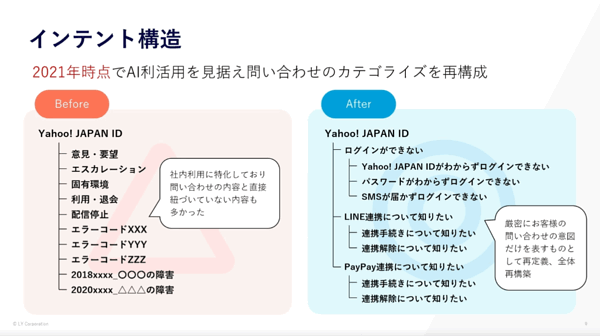 そこで2021年、ユーザーの問い合わせの意図を分類した「インテント構造」の見直しを実施。カテゴリ名を「ユーザーの問い合わせの意図」を表すものに限定し、全体を再構築した。