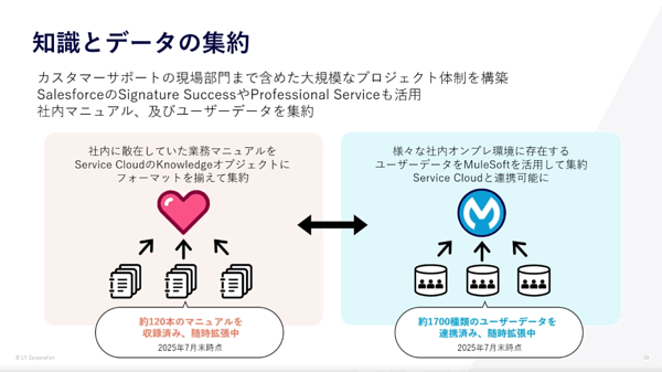 そしてデータ面では、散在していたマニュアルをSalesforceの「ナレッジオブジェクト」で集約。サイロ化している顧客情報は「MuleSoft」で統合し、「Service Cloud」につなげた。