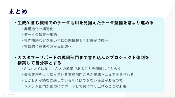 まとめとして、徳山氏は「まずはデータを整備することが大切」と改めて強調。データの構造化や集約に加えて、自動返信のようにユーザーの目に触れる部分では、マニュアルであっても社内用語を避け、誰が見ても理解できる表現を用いるべきだと語った。