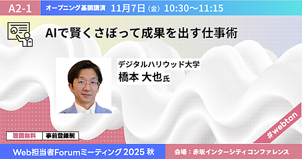 毎年大人気の橋本大也氏が今年も登壇します。効率化より一歩進んだ、AIで成果を出す仕事術を身につけましょう!
