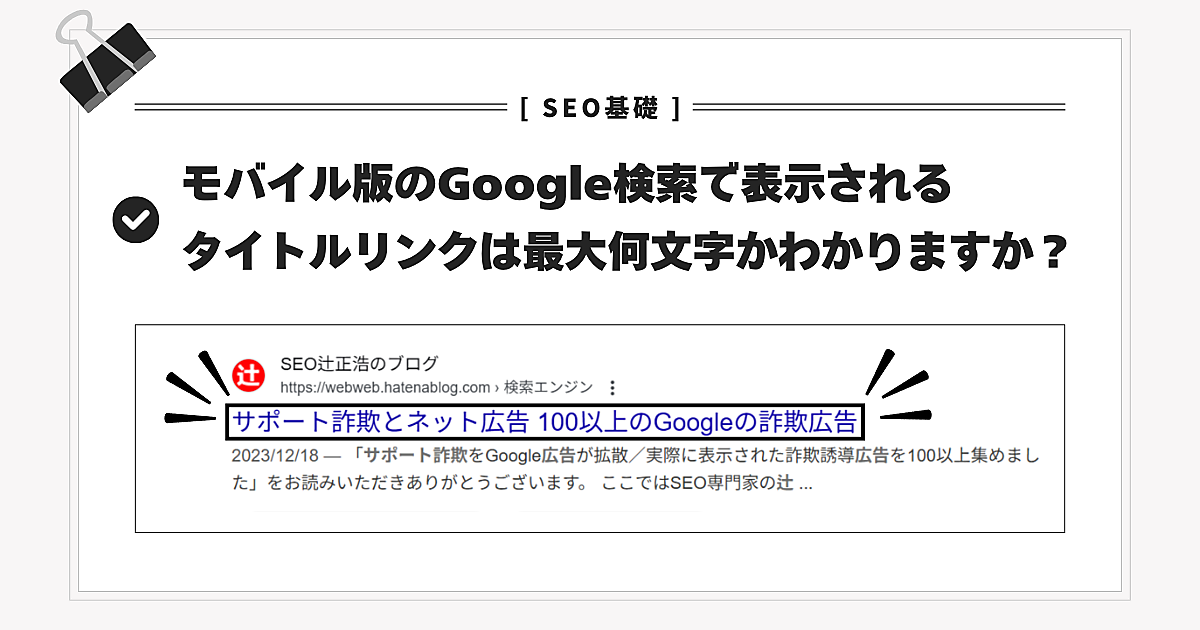 そのため冒頭の「モバイル版のGoogle検索で表示されるタイトルリンクは最大何文字ですか?」という質問への正確な答えは「環境によって異なるものの、一般的な端末では40文字前後」となります。