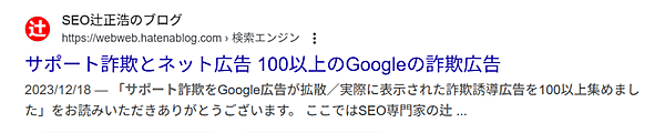 こちらの記事で「サポート詐欺」「ネット広告」「詐欺広告」のいずれかが省略されてしまうと、検索ユーザに記事の内容を十分に伝えることができません。そのため、読点をあえて使用し、PC検索でのタイトルリンクをコントロールしているのです。