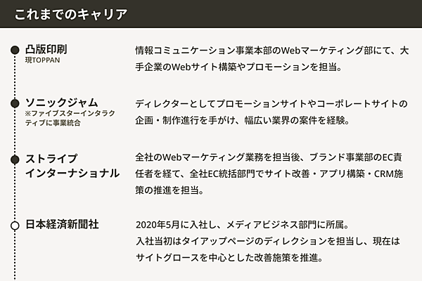 日本経済新聞社のメディアビジネス部門で、Webメディアの成長を牽引する岩田氏のキャリアは、凸版印刷(現:TOPPAN)のWebディレクターからスタートした。入社して約5年、大手のクライアントを担当して大規模なプロジェクトを任されていたが、岩田氏は漠然とした不安を感じていた。