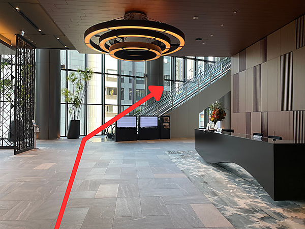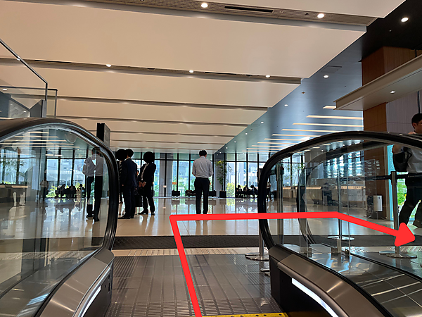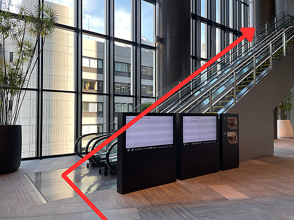 直進すると、エスカレーターが見えてきます。現在地は地下1階(B1F)で、このエスカレーターで2階のオフィスロビーまで上がります。