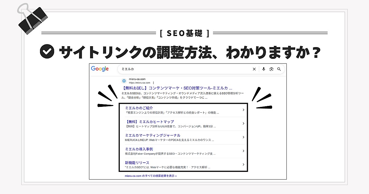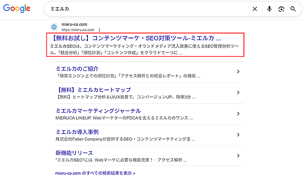 [ミエルカ ログイン] という検索語句であれば、ミエルカのログインページを探しているユーザが検索していると推測できます。しかし、 [ミエルカ] だけでは検索意図を絞れません。そのため、ユーザ自身が適切なランディングページを選べるように、サイトリンクを調整する必要があります。