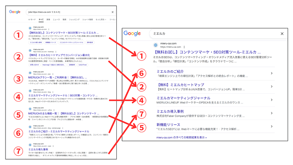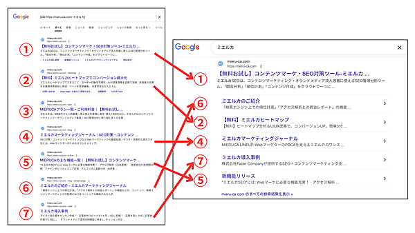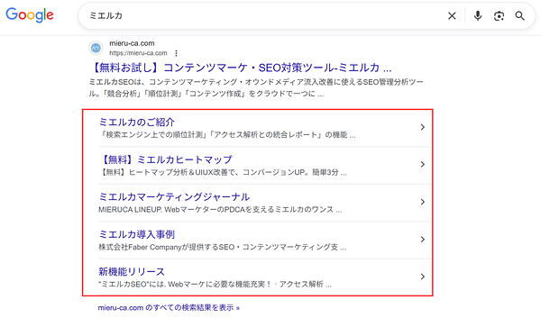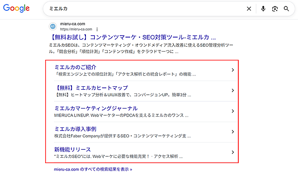 たとえば以下は、[site:https://mieru-ca.com/ ミエルカ] で検索した際の検索結果と、[ミエルカ] で検索した際のサイトリンクです。順番は多少異なりますが、[site:https://mieru-ca.com/ ミエルカ] で検索したときの2位、4~7位のページがサイトリンクに表示されています。