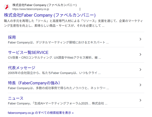 4つ目のサイトリンクに、「特長(FaberCompanyの強み)」というタイトル表示で以下のページが表示されています。
