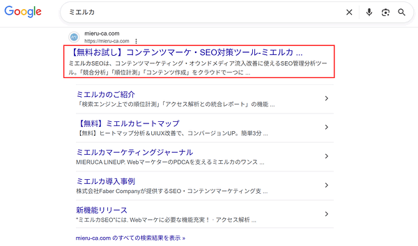 title要素を設定する際は、サイトリンクだけでなく通常のタイトルリンクで表示されるときのことも考えなければいけません。タイトルリンクの作り方の記事を参考にして、[site:https://mieru-ca.com/ ミエルカ] で上位を取りつつ、タイトルリンクも最適化できるtitle要素を目指しましょう。