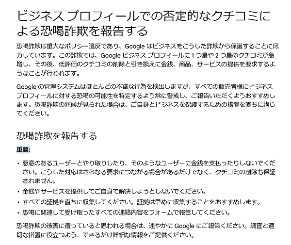 グーグル ビジネス プロフィールに投稿された否定的なクチコミによる恐喝詐欺を報告するためのヘルプ記事が追加された。