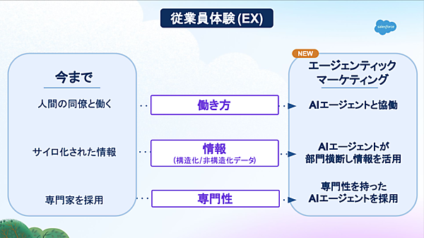 セールスフォース・ジャパン(以下、セールスフォース)は、Marketing Cloud Nextと富士通の導入事例を紹介するイベントを9月17日に開催した。冒頭、島田氏は「マーケティングの歴史において転換点となる製品で、『従業員体験』と『顧客体験』のどちらも大幅に変わる」と説明。まず、従業員体験は、「働き方」「情報」「専門性」の3つの観点で変化があるという(顧客体験は後述)。