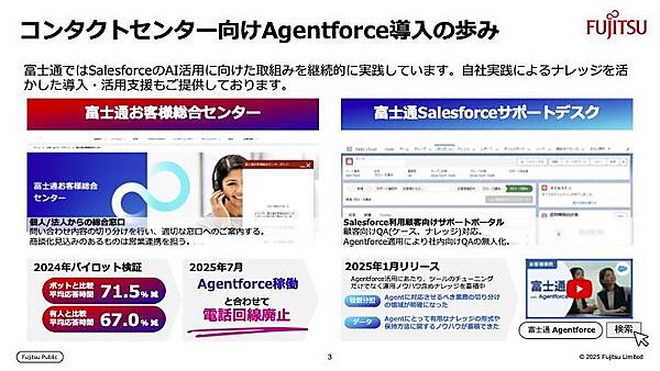 さかのぼると、同部署では、2024年に問い合わせ対応に特化したセールスフォースの自律型AIエージェント「Agentforce for Service」をパイロット検証として導入。従来のボットよりも複雑な対応を可能とし、ボットと比較して平均応答時間は71.5%減、有人との比較では67.0%減となった。2025年7月には、Agentforce for Serviceの正式導入と共に電話基盤を廃止、AIエージェントを軸とした対応に切り替え、業務効率化につなげているという。