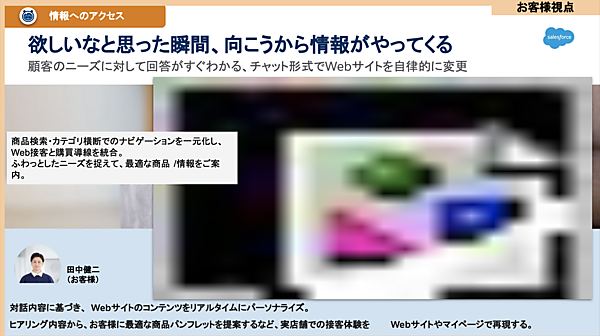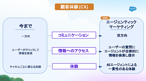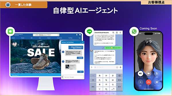 これまでは一方通行だったコミュニケーションが自然言語の会話による双方向になり、ユーザーの質問やリクエストに対してAIエージェントが自律的に情報を検索して提示できるようになります。また、チャネルごとに異なっていた体験が一貫性のある体験に変わります(島田氏)