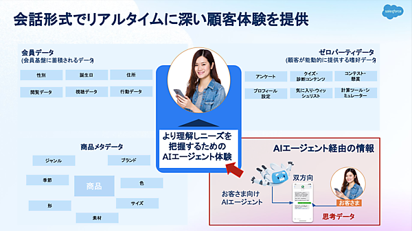 また、メールやLINEなど異なるチャネルであっても、AIエージェントにより一貫性のある体験、顧客情報に紐づいた個別対応が可能になる。これはAIエージェントが会員データや商品(サービス)のメタデータ、ゼロパーティデータなど多様なプラットフォームの情報を事前学習しているためだ。