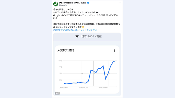 このグラフは、Googleトレンドの「あるキーワード」の検索推移を示したものだ。井水氏が理事を務めるウェブ解析士協会(WACA)のX公式アカウントで出題されたものだが、アクセス解析に強いフォロワー層でも、正解した人はごくわずかだったという。