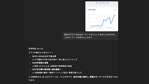 では、このグラフをChatGPTに読み込ませてみよう。「添付のグラフはあるキーワードのトレンドを示したものです。このキーワードは何でしょうか?」と質問したところ、グラフの特徴を分析したうえで、「インバウンド(訪日外国人観光)関連のキーワードがほぼ当てはまる」との回答が返ってきた。