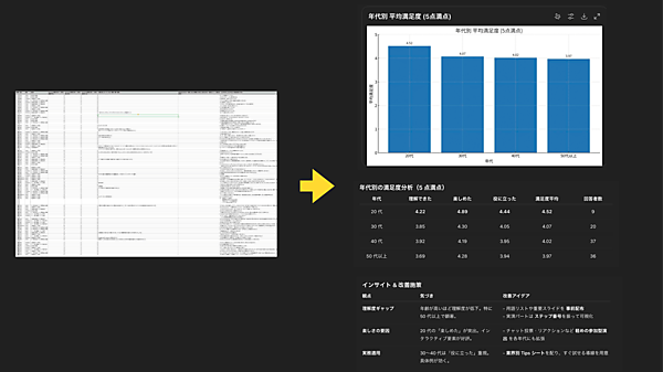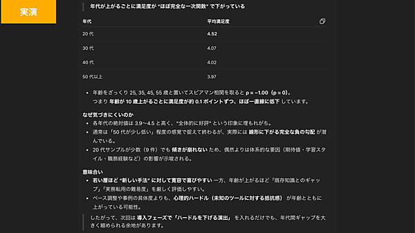 実際に入力すると、ChatGPTは「年代が上がるごとに満足度が“ほぼ完全な一次関数”で下がっている」と分析。さらに、「なぜこの傾向に気づきにくいのか」や「この考察から読み取れる課題」にまで言及し、次回に活かせる改善策をまとめてくれた。