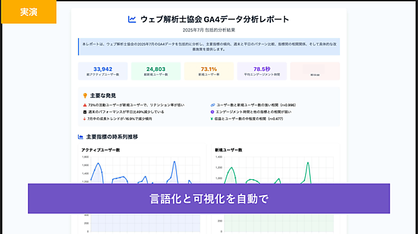 - 「添付はウェブ解析士協会のGA4のデータです。どのような傾向があるか分析して、今後の改善施策を示してください。また、わかりやすく視覚化してください」と入力