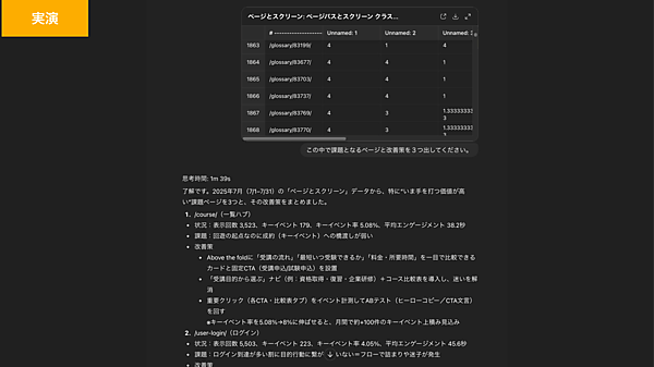 そんなときは、GA4の「ページとスクリーン」のデータをダウンロードしてChatGPTに読み込ませ、「この中で課題となるページと改善策を3つ出してください」と依頼するのがおすすめだ。