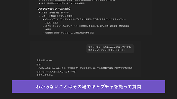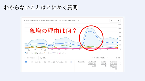 たとえば、上図をChatGPTに送り、「Direct急増の理由は何でしょうか」と質問すると、「参照元が落ちて“直来”扱いになった流入が一気に流れ込んだため」と回答があった。本来は別チャネルに入るはずのアクセスが、Directに誤分類されていたという。