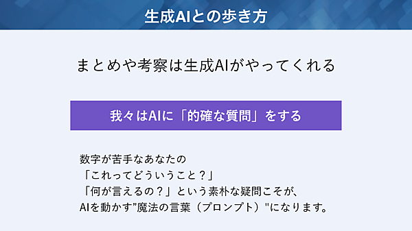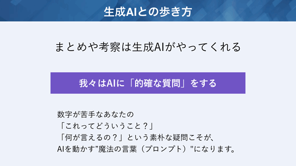 生成AIの回答の質は、ユーザーがどんなデータを与え、どんな質問をするかで大きく変化する。「これってどういうこと?」と疑問に思ったら、そのままAIに聞いてみてほしいと井水氏は語る。