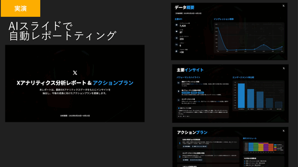 さらに、「SNSレポートをAIスライドで自動出力する方法」についても触れられた。