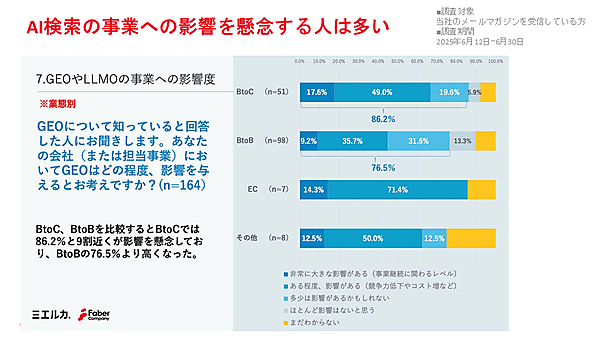 Faber Companyの調査によると、GEO(Generative Engine Optimization:生成エンジン最適化)や、「Large Language Model Optimization(大規模言語モデル最適化)」などのAI検索が事業に与える影響について懸念を抱く企業は、BtoBで76.5%、BtoCでは86.2%にのぼるという。