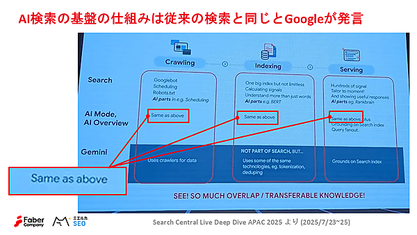 こうしたAI検索を取り巻く環境の変化は世界的にも注目されている。検索領域を牽引してきたGoogleはどう説明しているのだろうか。市川氏は、2025年7月に開催されたGoogle公式イベント「Search Central Live Deep Dive APAC 2025」で、「AI検索の基盤の仕組みは従来の検索と同じである」との発言があったことを紹介した。