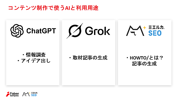 具体的には、日常的な会話や情報調査のなかで生まれるアイデアの抽出には、対話型AIアシスタントの「ChatGPT」を利用し、同じくチャットAIの「Grok」で取材音声の文字起こしをもとに記事生成を行う。その後、「How to記事」と「〜とは記事」については「ミエルカSEO」のAI機能「簡単AI記事生成機能」を活用して情報を整理し、コンテンツ化を図っているという。