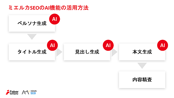 「ミエルカSEO」のAI機能「簡単AI記事生成機能」は、記事制作における下記の各工程で使うことができ、ステップに沿って順に入力していくことで、スムーズに作業できる。