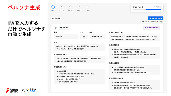 「どのようなお客様をターゲットにするか」を明確にする工程。業界、よく見る媒体、年代などの細かな属性も含めてキーワードを入力するだけで、ペルソナが自動生成される。