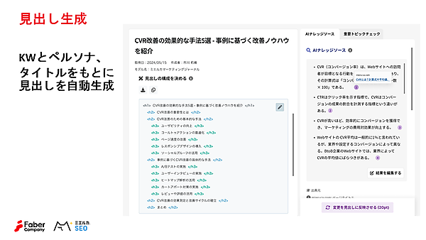 ペルソナとタイトルをもとに、見出しが自動生成される。AIモデルには情報の更新タイミングや知識の範囲に制約があるため、テーマに関連する内容について自動的にGoogle検索を行い、Web上の最新情報や補足情報をAIに取り込んだうえで、見出しを生成する仕組みになっている。そのため、AIが元々持っていないようなニッチな情報や、直近のトレンドなども反映させることが可能。また検索上位コンテンツのトピックをチェックし、自動的に組み込む機能も備えている。
