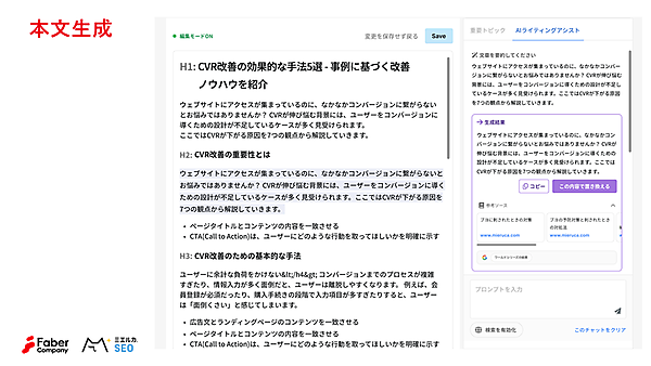 選択した見出しに基づいて本文を作成する。編集などが画面上でできるため、チューニングしながら内容をブラッシュアップさせていくことができる。