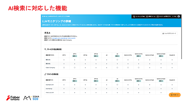さらに、「ミエルカSEO」では、作成したコンテンツのAI検索における現在地をトラッキングできる機能として、「LLMモニタリング」機能の提供を開始した。指定したサービス名やブランド名、自社サイト、あるいは競合のサイト・サービス名が、各種AIツール上でどのように認識・言及されているかを一括で調査できるというものだ。