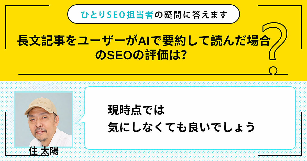 今回の質問は「長文記事をユーザーがAIで要約して読んだ場合のSEOの評価は?」というものです。ペンネーム「kurage」さんが寄せてくださいました。
