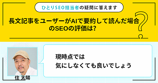 ひとりで頑張るSEO担当者さんの悩みに答える本連載。今回の質問は「長文記事をユーザーがAIで要約して読んだ場合のSEOの評価は?」です。