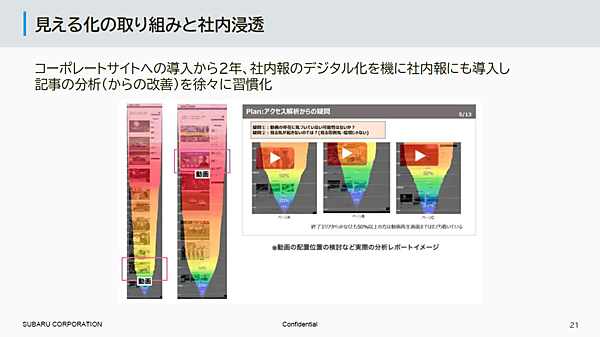 分析ツールの活用は広報部内にも浸透しつつある。たとえば、社内報チームは、社内報がデジタル化されたのを機にヒートマップツールを導入した。社内報の動画コンテンツの掲載位置によってユーザーの反応や閲覧傾向にどのような差が生じるかを検証し、記事の改善につなげている。このように、他のチームでもデータを活用した改善が習慣化してきたのは大きな変化だと感じているという。