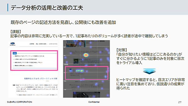 続いて、具体的なデータ分析による改善事例を紹介する。コーポレートサイトでは、2022年よりSUBARUらしさを体現する社員の仕事への思いや取り組みを紹介する読み物系のコンテンツ「SUBARUびと」を開始した。
