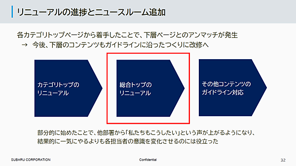 今回のリニューアルで、各カテゴリートップページと総合トップページのリニューアルが完了した。今後、下層ページをガイドラインに沿ったつくりに順次更新予定だ。カテゴリのトップページを変えたことで、他部署からも「下層ページを変えたい」という声が出ているという。全体を一気にやらずに、部分的にリニューアルを始めたことで、各担当者から「こうしたい」という声があがり、担当者の意識が変わりつつあるという。