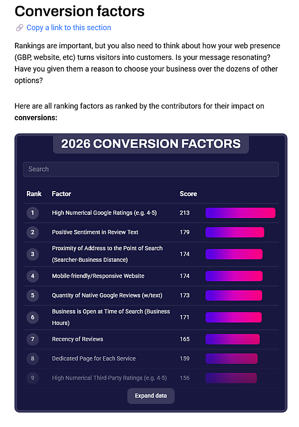 47名のローカルSEO専門家に聞き取り調査し、187の要因について0点~5点で評価してもらったものを、合計点の高い順にランキングとしてまとめたものだ。